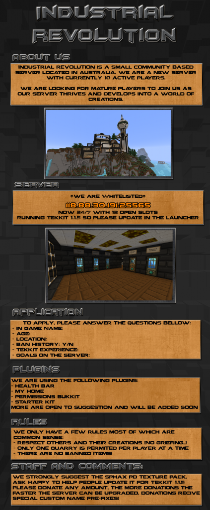 Minecraft Servers Australia Tekkit / Grief prevention i conomy essentials enjin and many many more!. Servers hosted centrally in sydney, nsw. So why not join us? List of free top tekkit servers in minecraft with mods, mini games, plugins and statistic of players. Play minecraft with your friends in australia on a server with. With so many options,you'll never be bored!